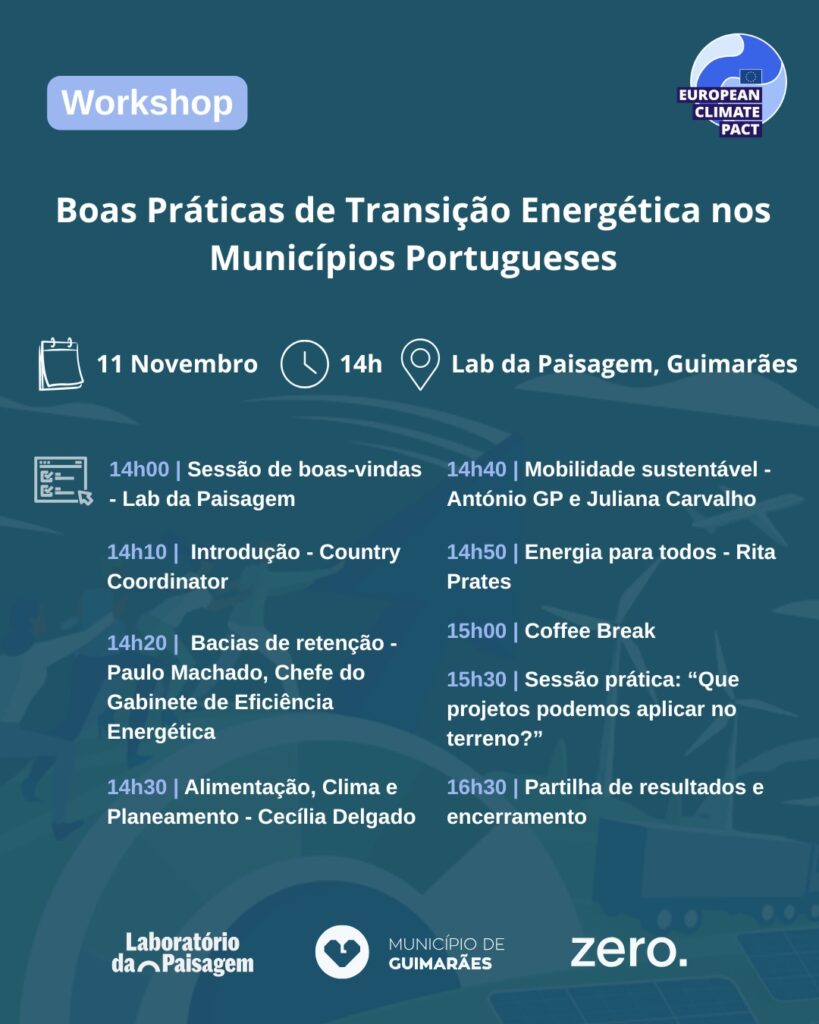 O evento “Boas Práticas de Transição Energética nos Municípios Portugueses” conta com a presença de Dalila Sepúlveda, diretora do Departamento de Ambiente e Sustentabilidade da Câmara Municipal de Guimarães, e Carlos Ribeiro, diretor-executivo do Laboratório da Paisagem. A ação é particularmente dirigida a autarcas e técnicos autárquicos que integram as comunidades intermunicipais do Ave, do Tâmega e Sousa, do Cávado, do Alto Minho e da Área Metropolitana do Porto.