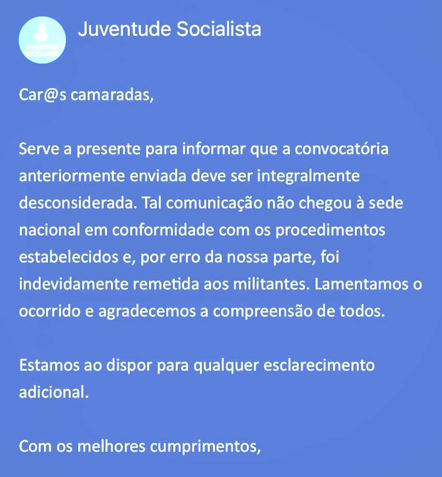 O dirigente juvenil não explica, contudo, que a convocatória enviada aos militantes da JS estava ferida de legalidade, desde logo a de admitir como única via para a formalização das listas o envio digital para o seu endereço pessoal, tal como este jornal noticiou.