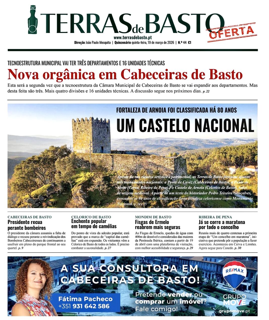 Já em Mondim de Basto, a notícia desta primeira página é a apresentação do novo miradouro das Fisgas de Ermelo. Acontece a 19 de abril. As Fisgas de Ermelo são umas quedas de água com 400 metros de desnível, consideradas das maiores da Península Ibérica. Vão contar a partir de agora com uma plataforma de visitação, que facilita a acessibilidade e dá mais segurança.